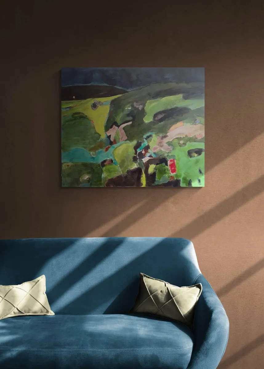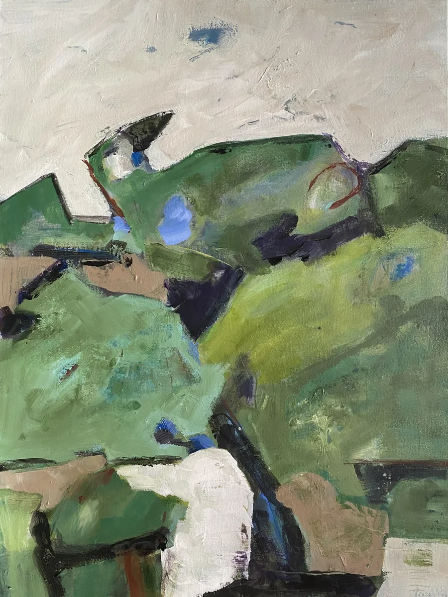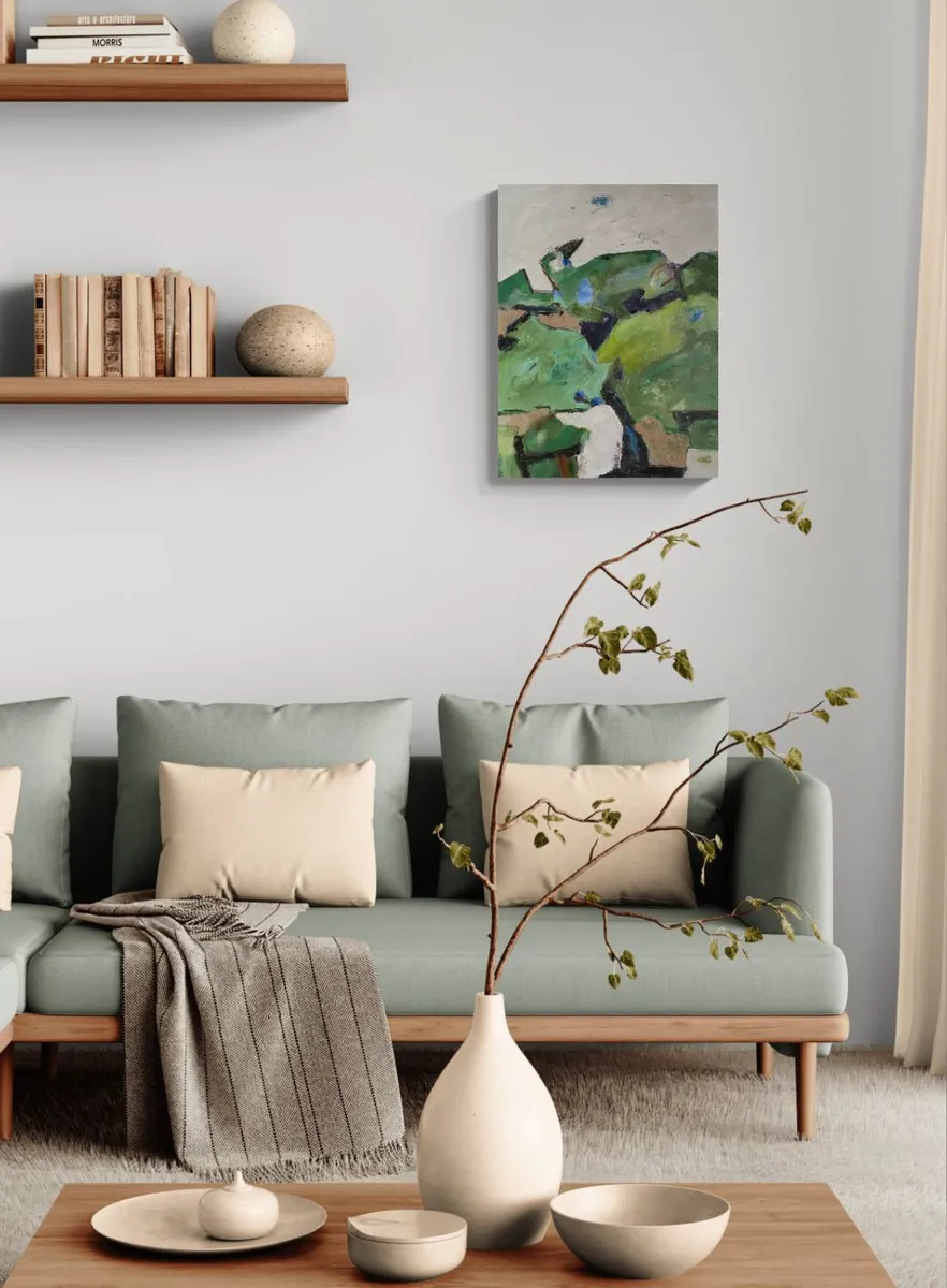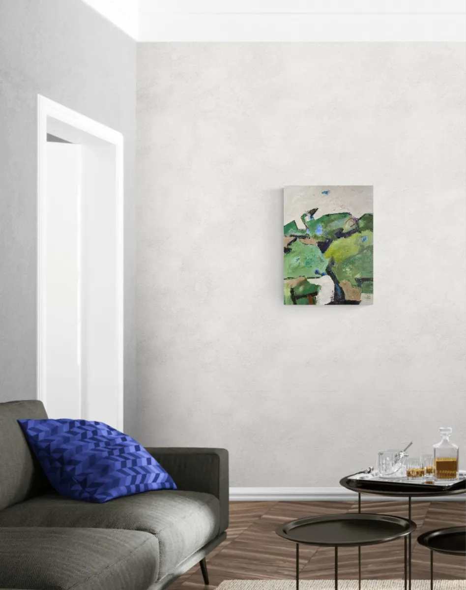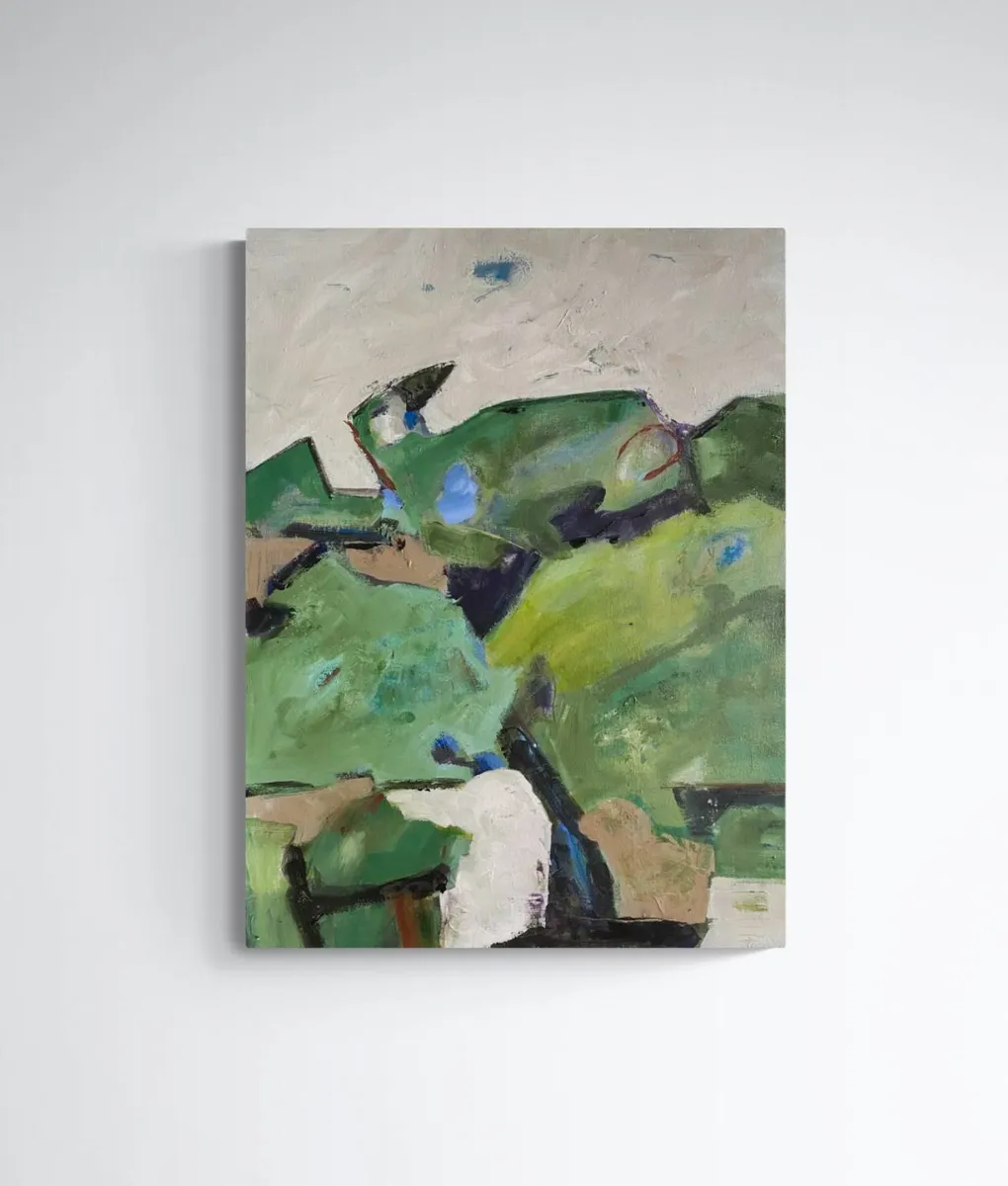 This acrylic painting on linen canvas draws from the story and experience of Otagi Nenbutsu-ji Temple, nestled in the hills outside Kyoto, Japan. In the mid-1950s, Kocho Nishimura, a sculptor and head monk, revitalized the temple with an extraordinary fundraising idea. Visitors were invited to carve their own stone statues under his guidance. Today, over 1,200 unique statues, each shaped by a different hand, stand weathered among the surrounding vegetation, embodying individuality within a shared collective spirit. The composition reflects the interplay between these carvings and the lush, natural environment. The muted greens and earthy tones evoke the moss-covered hills, while layers of texture and abstract forms hint at the weathered figures nestled within. The upper portion of the painting, with its open and light-filled expanse, contrasts with the dense greenery below, creating a sense of space and quiet reflection. The brushstrokes range from loose and gestural to more defined, mimicking the organic yet deliberate nature of the carved statues. Subtle marks and colors embedded in the greenery suggest hidden figures, encouraging viewers to look closely, as though they were wandering the temple grounds and discovering each stone for themselves. This painting seeks to capture the feeling of walking through this sacred site, where human creativity and the natural world converge. It reflects the impermanence of the sculptures as they are gradually reclaimed by the landscape, yet honors their enduring presence as storytellers of a shared past. Through abstraction, the work invites viewers to reflect on themes of individuality, time, and the quiet harmony between art and nature.