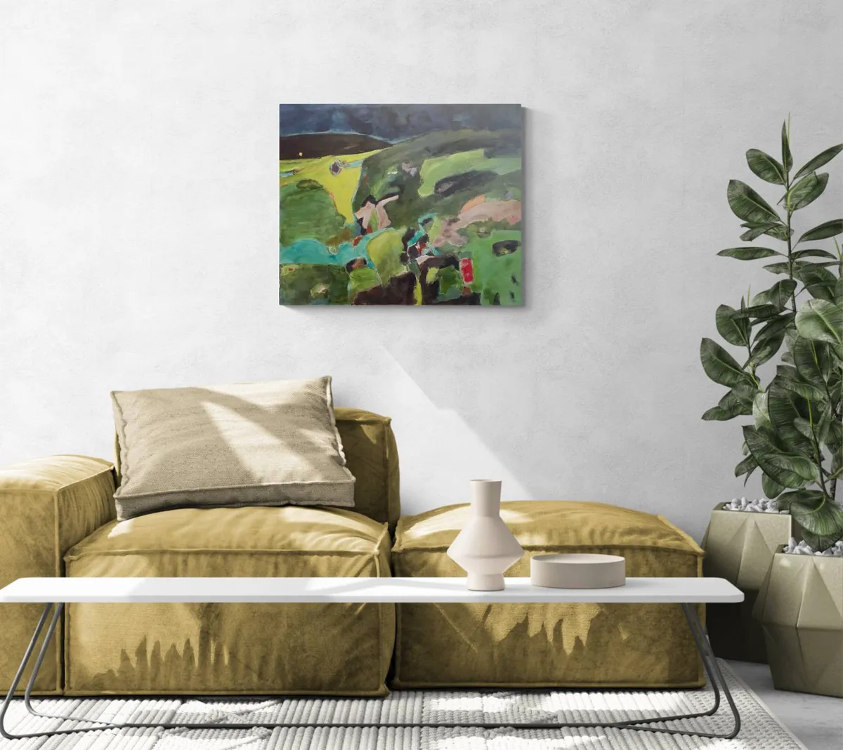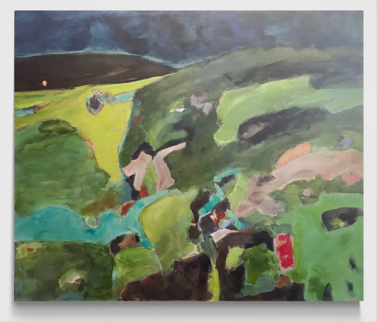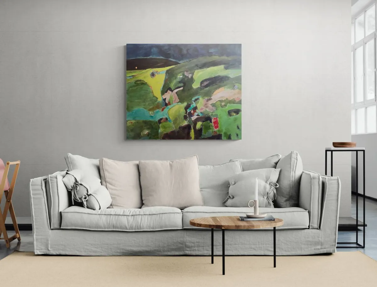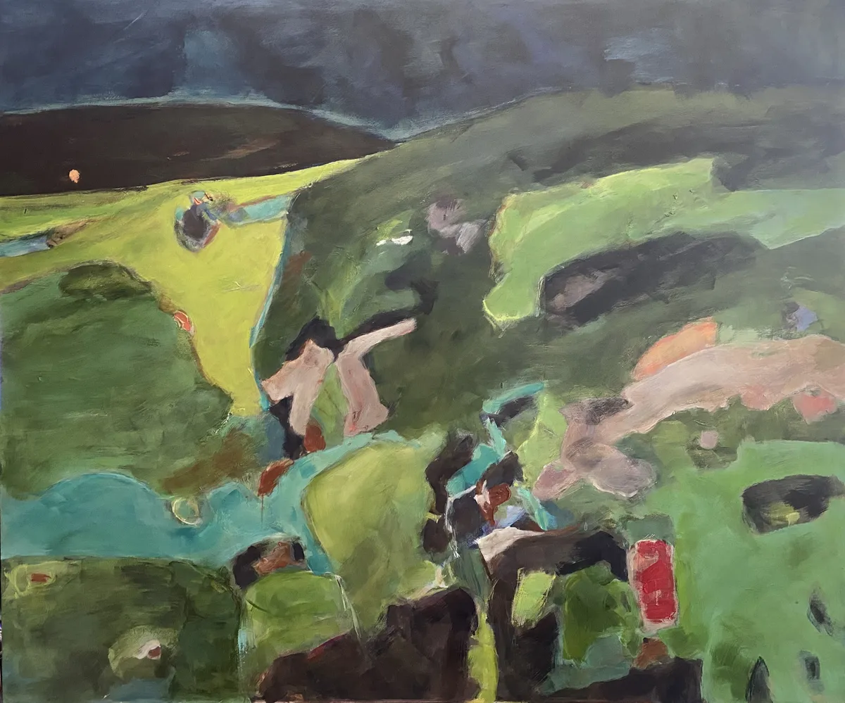 This acrylic painting on linen canvas draws from the story and experience of Otagi Nenbutsu-ji Temple, nestled in the hills outside Kyoto, Japan. In the mid-1950s, Kocho Nishimura, a sculptor and head monk, revitalized the temple with an extraordinary fundraising idea. Visitors were invited to carve their own stone statues under his guidance. Today, over 1,200 unique statues, each shaped by a different hand, stand weathered among the surrounding vegetation, embodying individuality within a shared collective spirit. The composition reflects the interplay between these carvings and the lush, natural environment. The muted greens and earthy tones evoke the moss-covered hills, while layers of texture and abstract forms hint at the weathered figures nestled within. The upper portion of the painting, with its open and light-filled expanse, contrasts with the dense greenery below, creating a sense of space and quiet reflection. The brushstrokes range from loose and gestural to more defined, mimicking the organic yet deliberate nature of the carved statues. Subtle marks and colors embedded in the greenery suggest hidden figures, encouraging viewers to look closely, as though they were wandering the temple grounds and discovering each stone for themselves. This painting seeks to capture the feeling of walking through this sacred site, where human creativity and the natural world converge. It reflects the impermanence of the sculptures as they are gradually reclaimed by the landscape, yet honors their enduring presence as storytellers of a shared past. Through abstraction, the work invites viewers to reflect on themes of individuality, time, and the quiet harmony between art and nature.