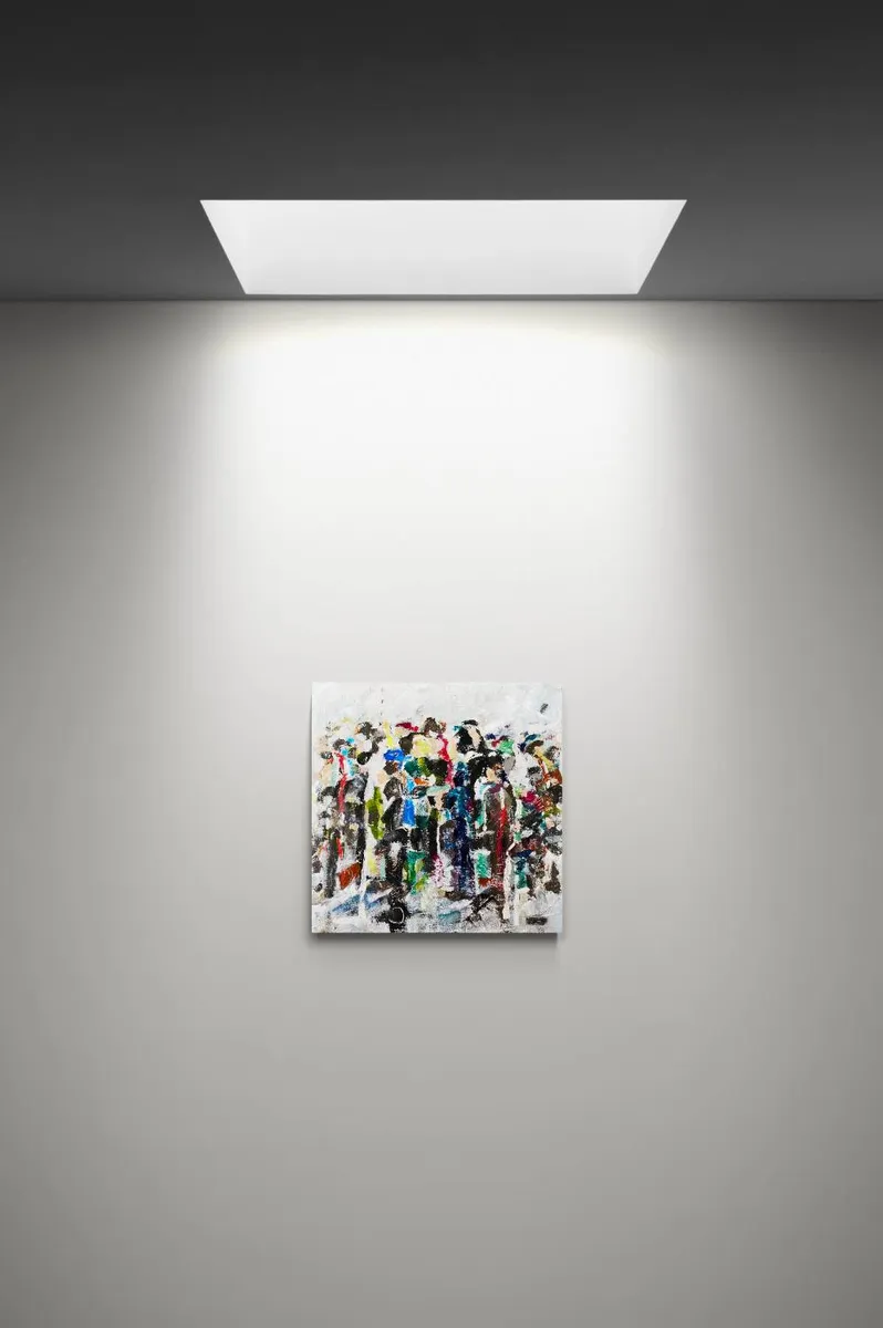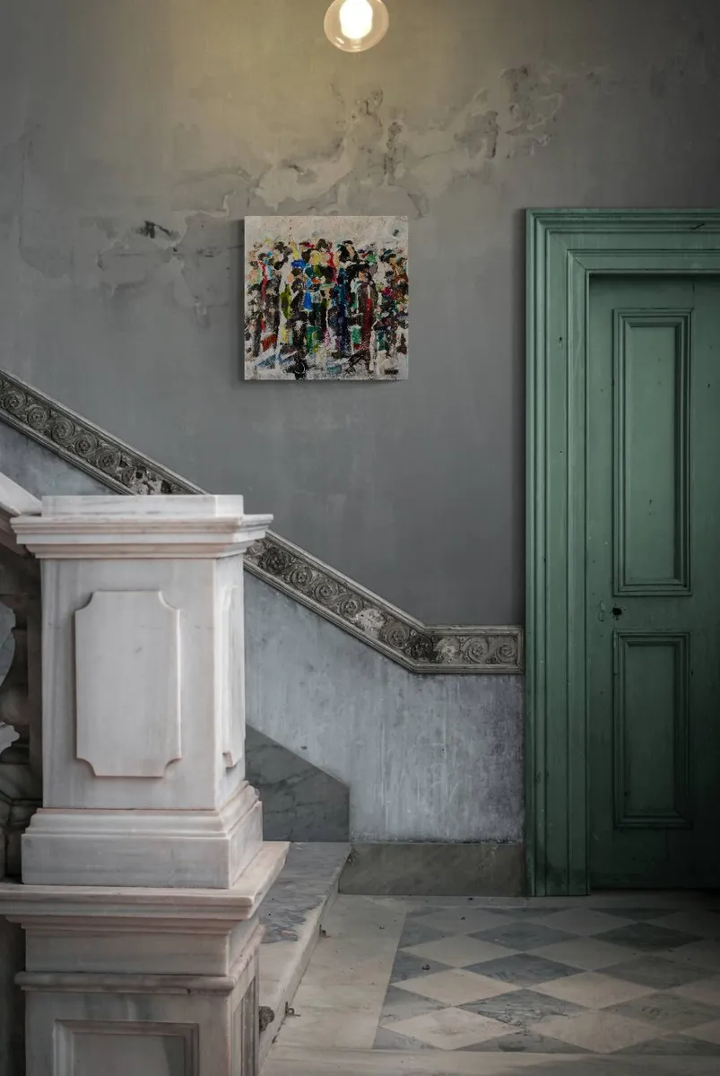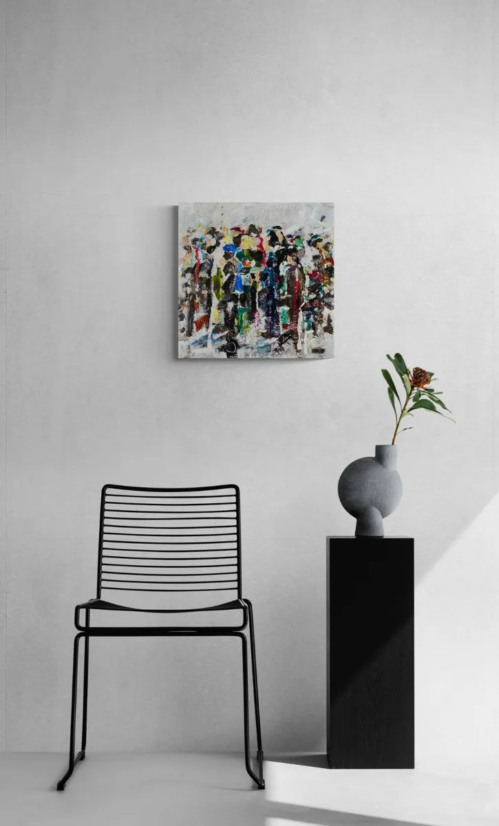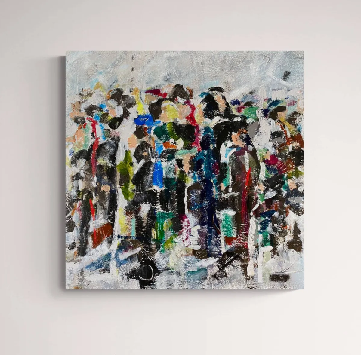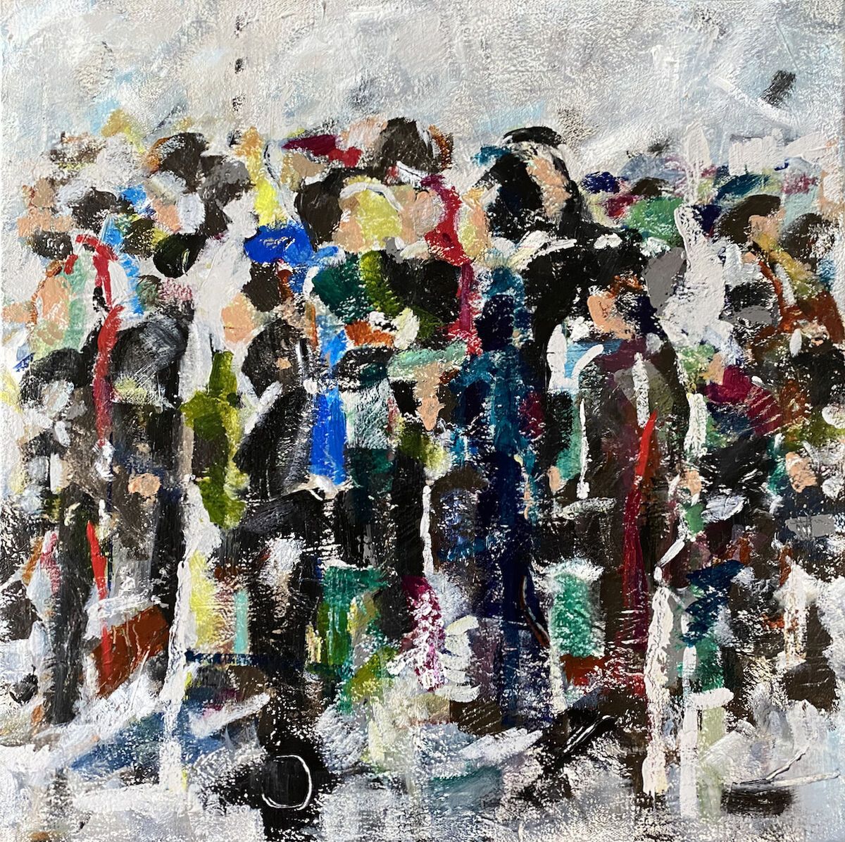 This acrylic and gesso painting on linen wrapped canvas captures the movement and energy of a crowd through abstraction. Layers of bold color, textured brushstrokes, and gestural marks blend together, reflecting the rhythm and density of people in motion. The forms are intentionally blurred and overlapping, emphasizing the collective over the individual. The texture created with gesso adds depth and a tactile quality, mirroring the visual complexity of a crowd. This piece focuses on the atmosphere of the moment—where movement, color, and connection merge into a single dynamic whole.