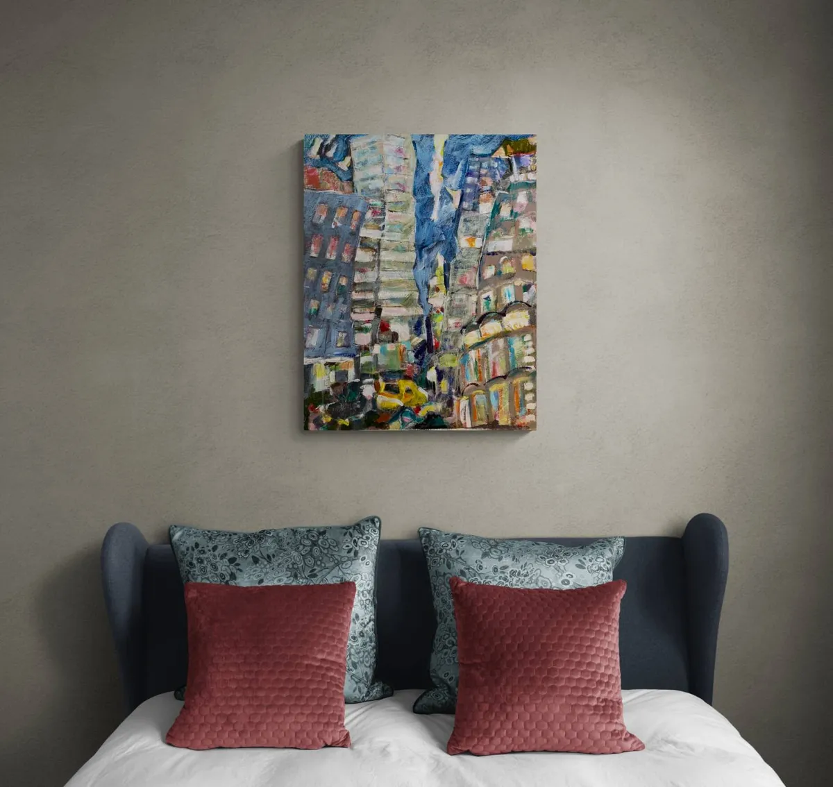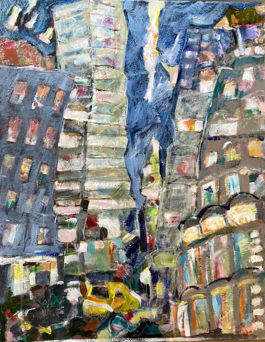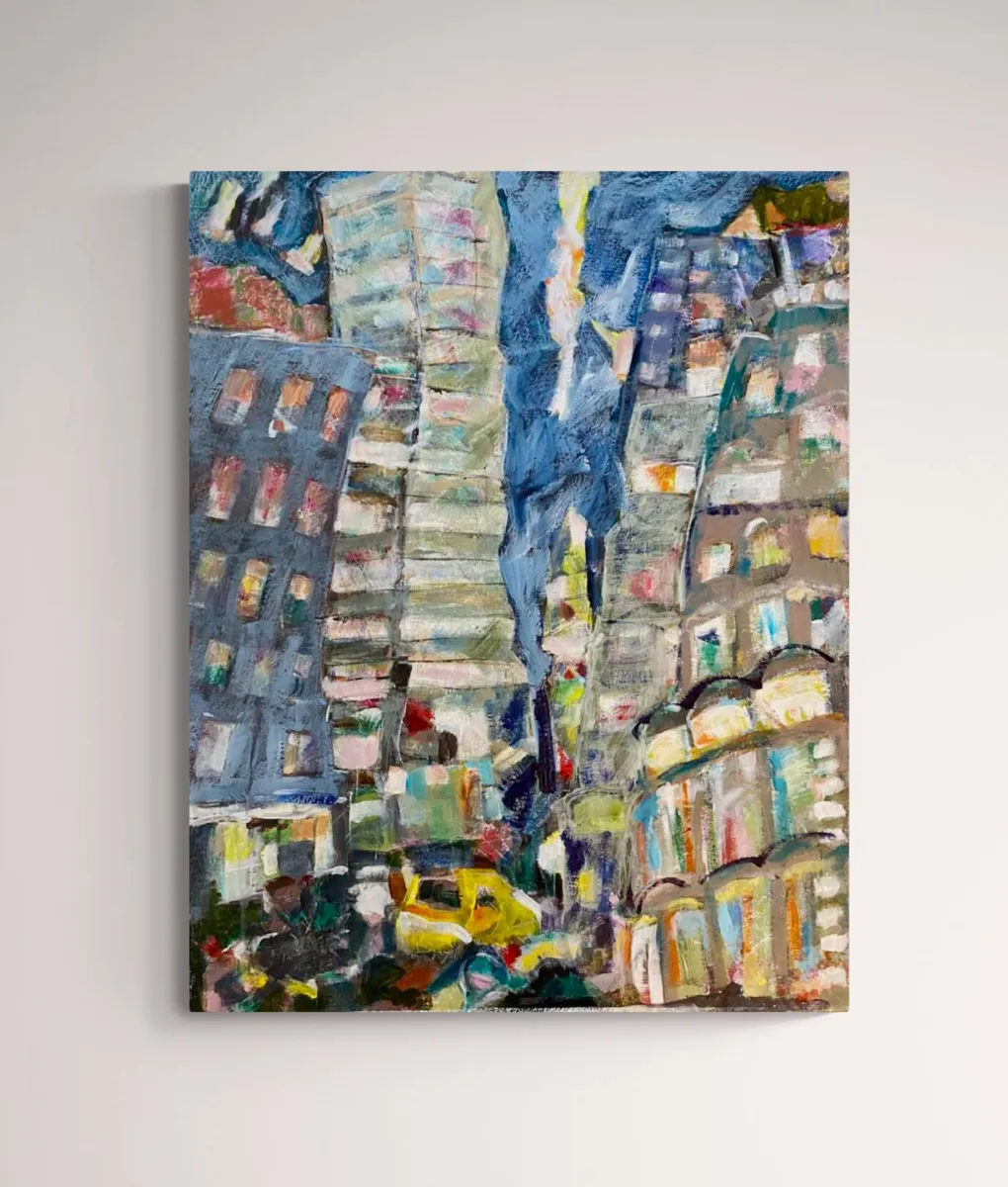 This acrylic painting on wrapped canvas the vertical energy and layered textures of New York City’s urban landscape. Muted grays and blues are punctuated by bursts of warm yellows and reds, reflecting the interplay of light and motion in the city. Bold brushstrokes and dynamic vertical lines convey the upward momentum of the towering buildings, while fragmented forms suggest the constant movement of the streets below. The piece explores the rhythm and complexity of the city, offering a snapshot of its energy, light, and ever-changing atmosphere.It was Awarded Honorable Mention prize in Teravarna 7th Color Juried Art Contest 2024.