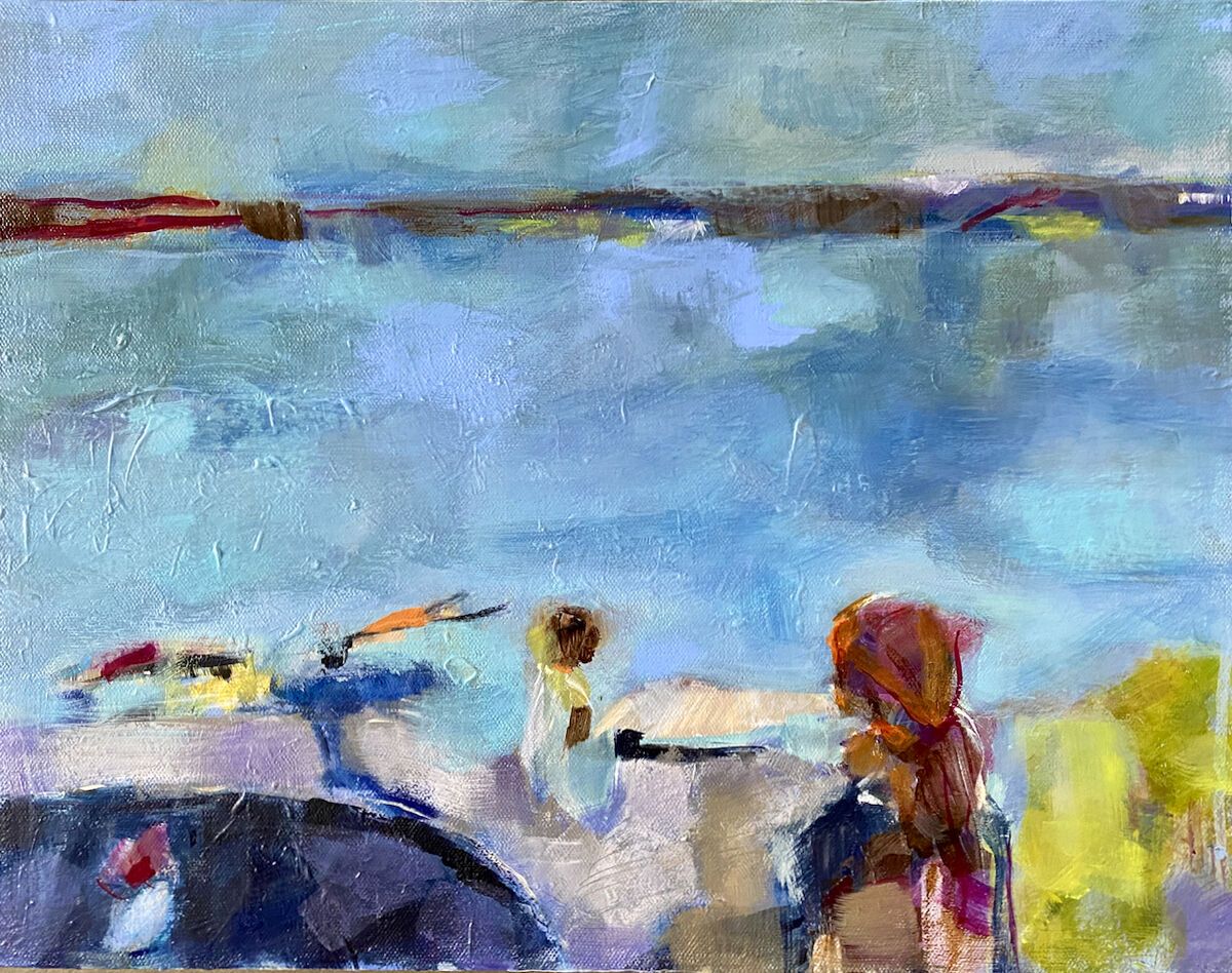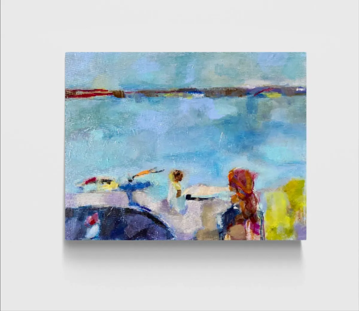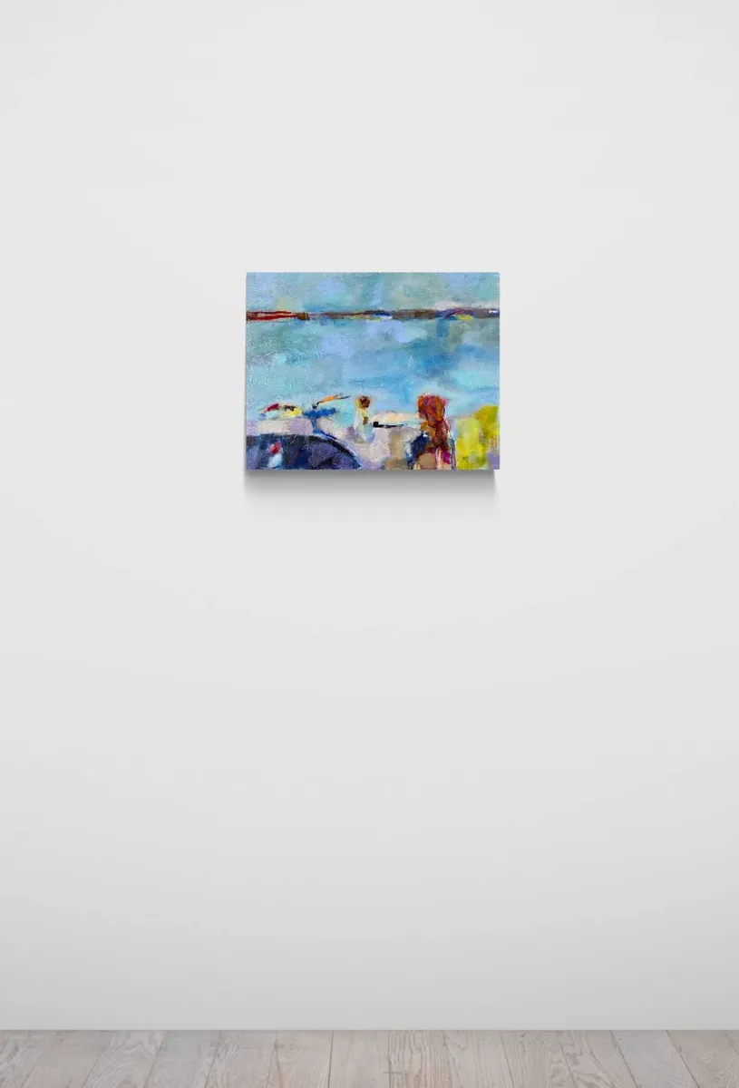 This acrylic and gesso painting on linen canvas captures a serene, abstract view of figures on the bayside of Bald Head Island, gazing across the water toward the mainland. Soft blues and grays evoke the calm openness of the bay, while warm color accents bring life to the figures and shoreline. Loose brushstrokes and textured layers create depth and movement, suggesting shifting light and the quiet energy of the scene. The simplified figures blend into the landscape, emphasizing their connection to the environment. This piece explores stillness, distance, and the beauty of the horizon—a moment where land, water, and sky come together in harmony.