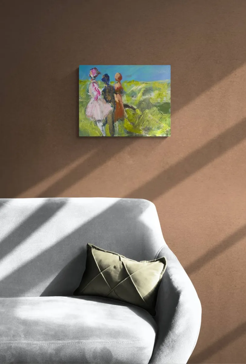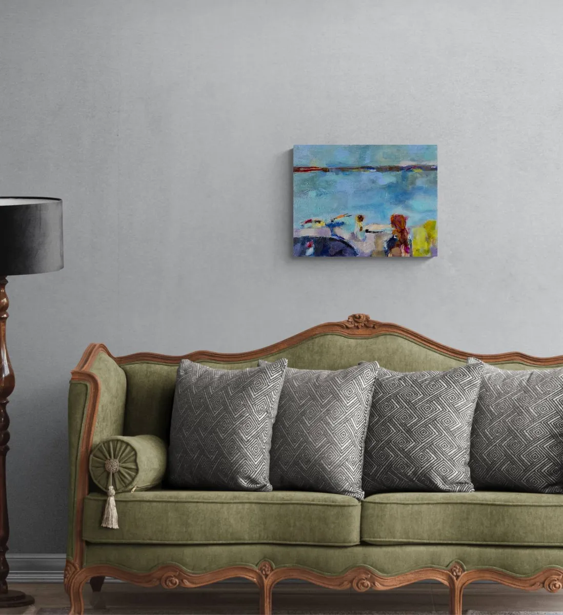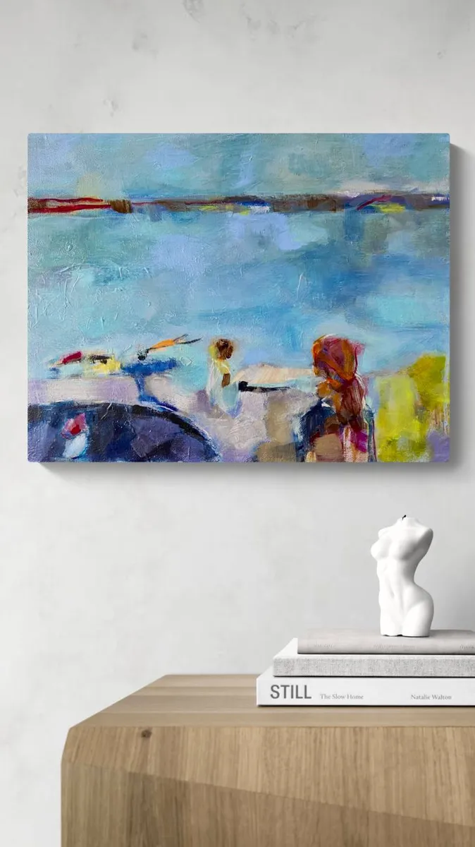This acrylic and gesso painting on linen canvas captures a serene, abstract view of figures on the bayside of Bald Head Island, gazing across the water toward the mainland. Soft blues and grays evoke the calm openness of the bay, while warm color accents bring life to the figures and shoreline. Loose brushstrokes and textured layers create depth and movement, suggesting shifting light and the quiet energy of the scene. The simplified figures blend into the landscape, emphasizing their connection to the environment. This piece explores stillness, distance, and the beauty of the horizon—a moment where land, water, and sky come together in harmony.