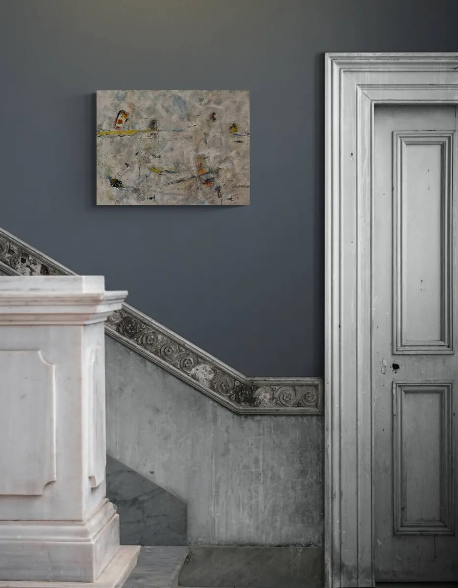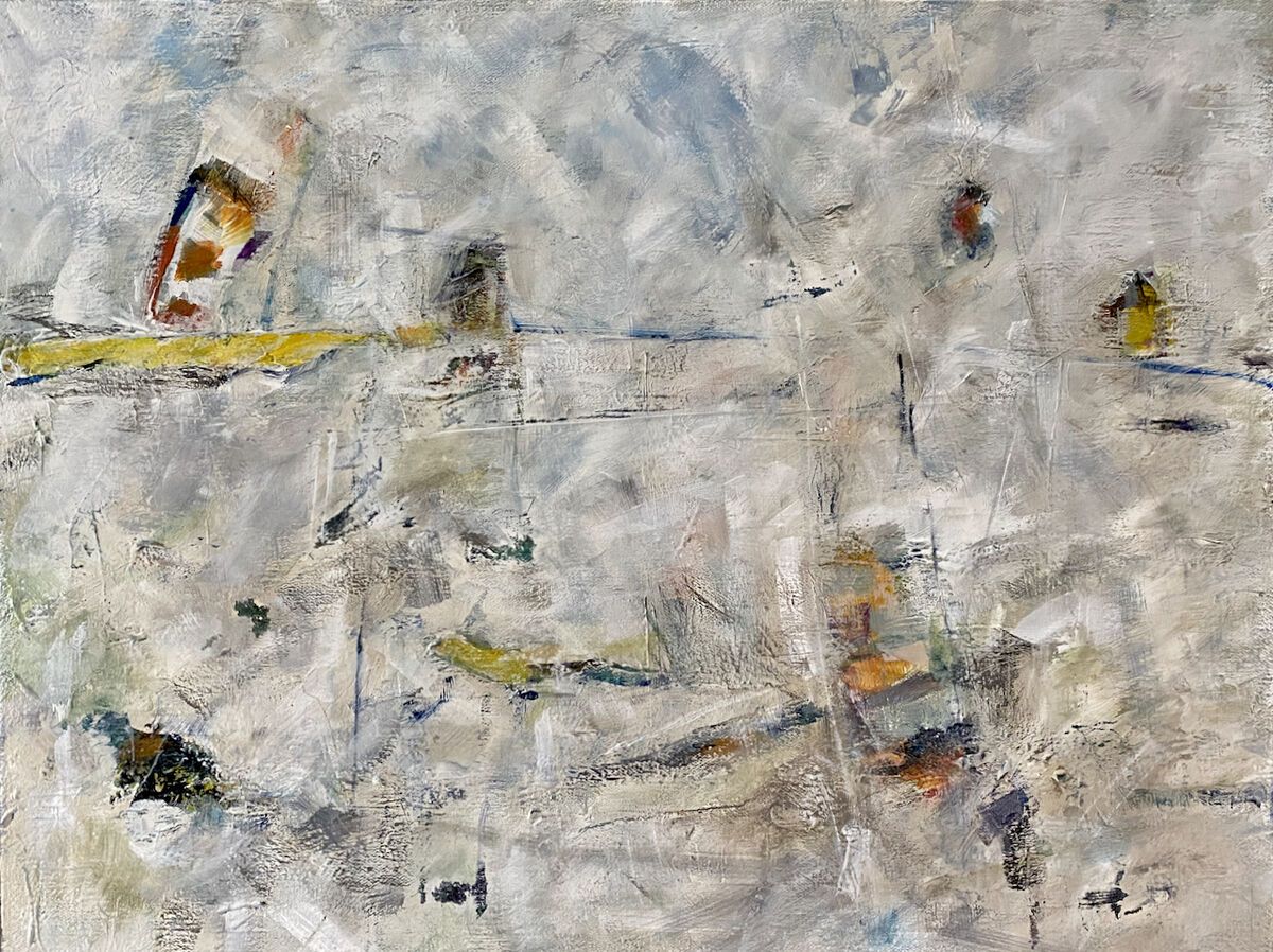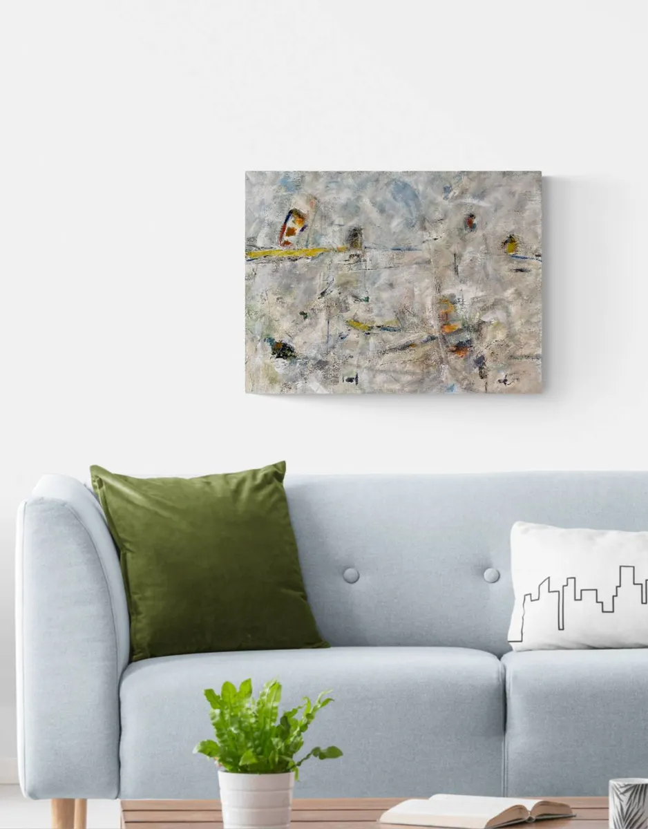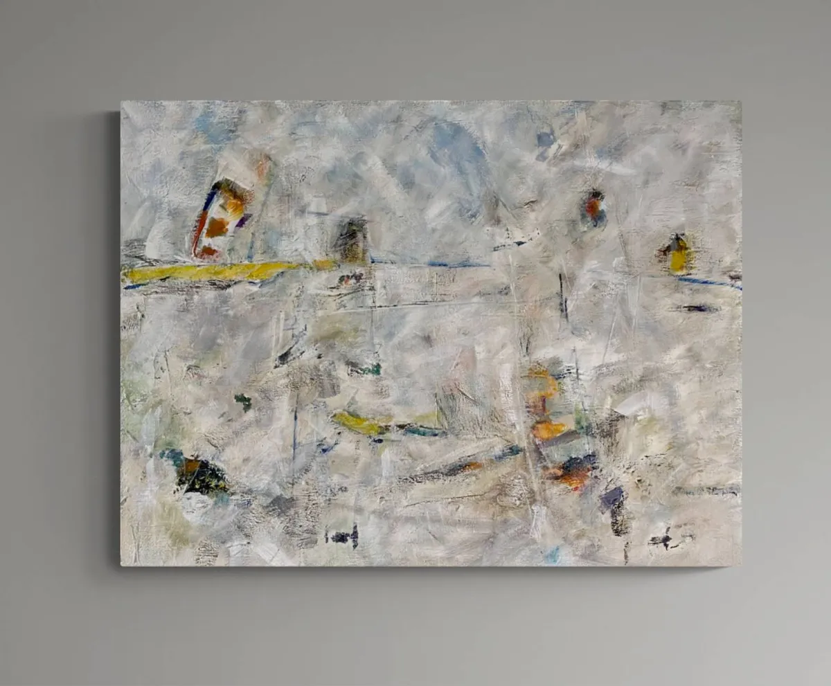 This multi-layered acrylic and gesso painting on wrapped canvas began as an urban study but evolved into a textured abstraction. Subtle tones of grays, whites, and earth tones form a complex surface, where hints of structure and movement emerge. Layered brushwork, scraping, and mark-making reflect the energy and rhythm of an urban environment, softened into something ethereal and contemplative. The piece balances structure with spontaneity, inviting the viewer to explore its quiet details and shifting forms. Finished edges; ready to hang.
