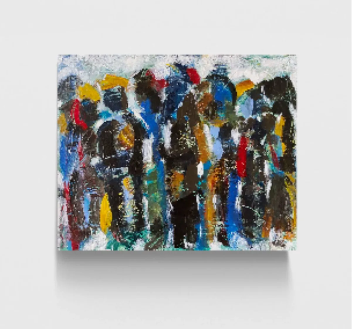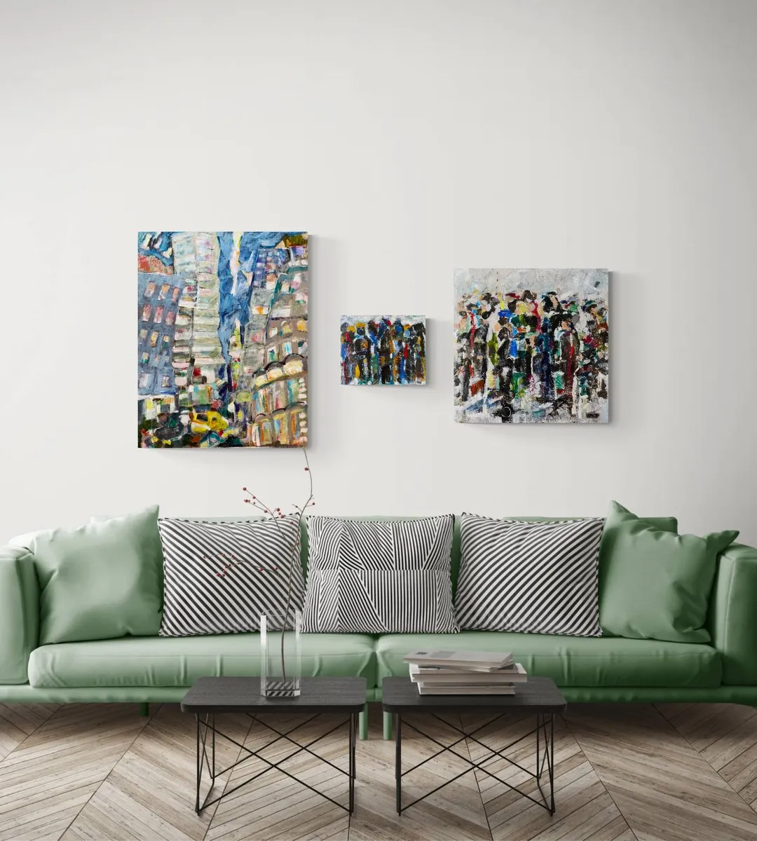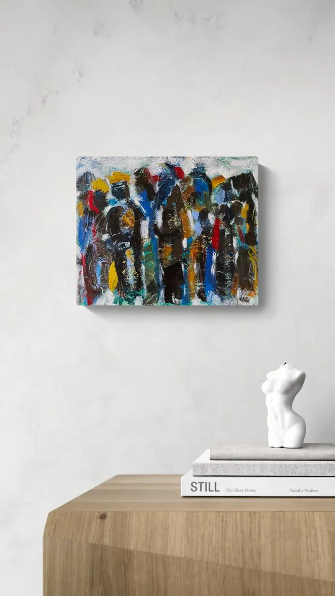 This abstract acrylic painting on linen-wrapped canvas captures the energy of human connection. Bold colors—deep blues, blacks, and reds and golds—suggest figures in motion, blending and merging like moments in a crowd. Layered brushstrokes and textures create rhythm and depth, inviting viewers to interpret their own stories within the scene. The gallery-wrapped canvas has finished edges and is ready to hang.