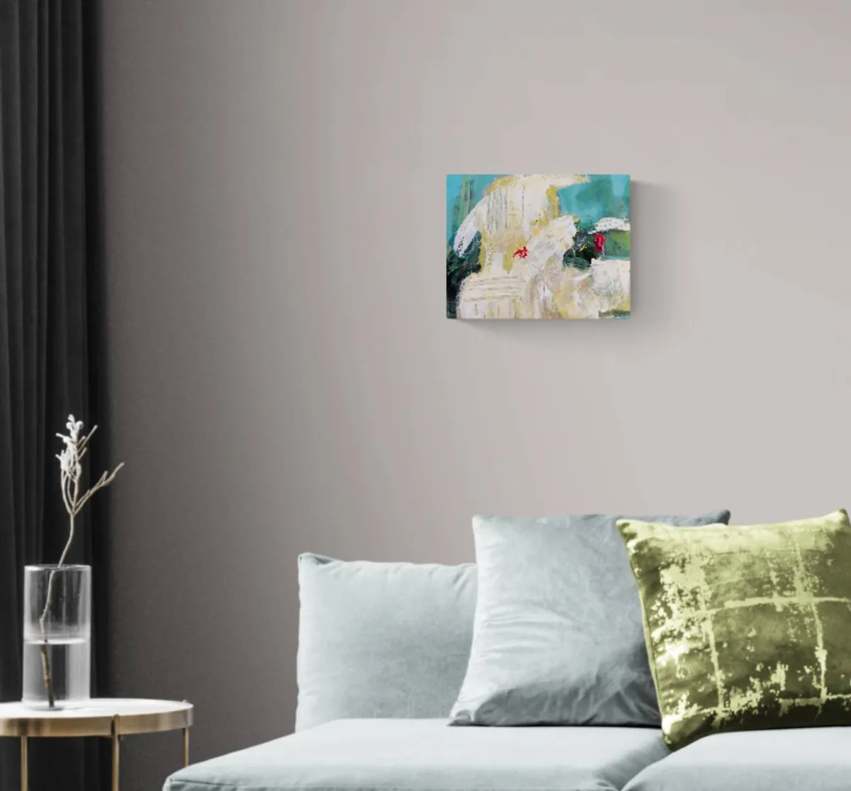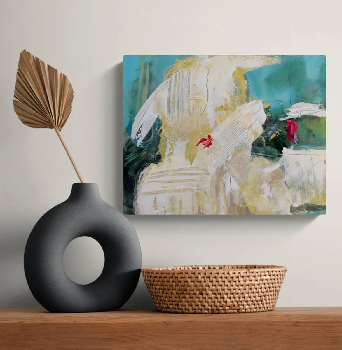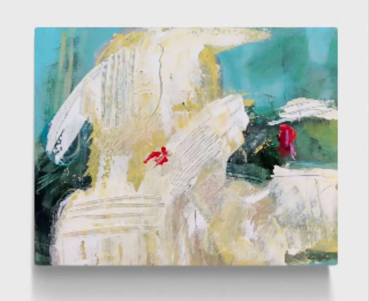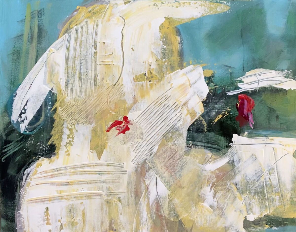 This abstract portrait on wrapped canvas captures an imagined moment—a lingering glance and final kiss. Created with acrylic and gesso, the piece uses bold, gestural brushstrokes and a layered palette of soft neutrals, greens, and touches of vibrant red. The textured surface, built with palette knife work and varied mark-making, evokes both movement and stillness, embodying the fleeting yet poignant nature of the scene. The composition balances raw emotion with fluid abstraction, inviting viewers to connect with the universal feeling of farewell and the quiet intimacy of a shared moment. Invited to the LELA Juried Exhibition Lust and Love 2024.
