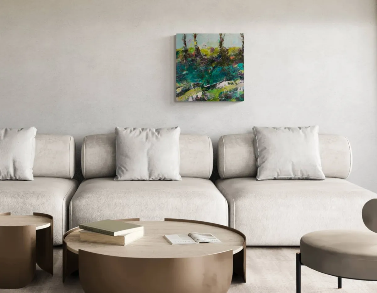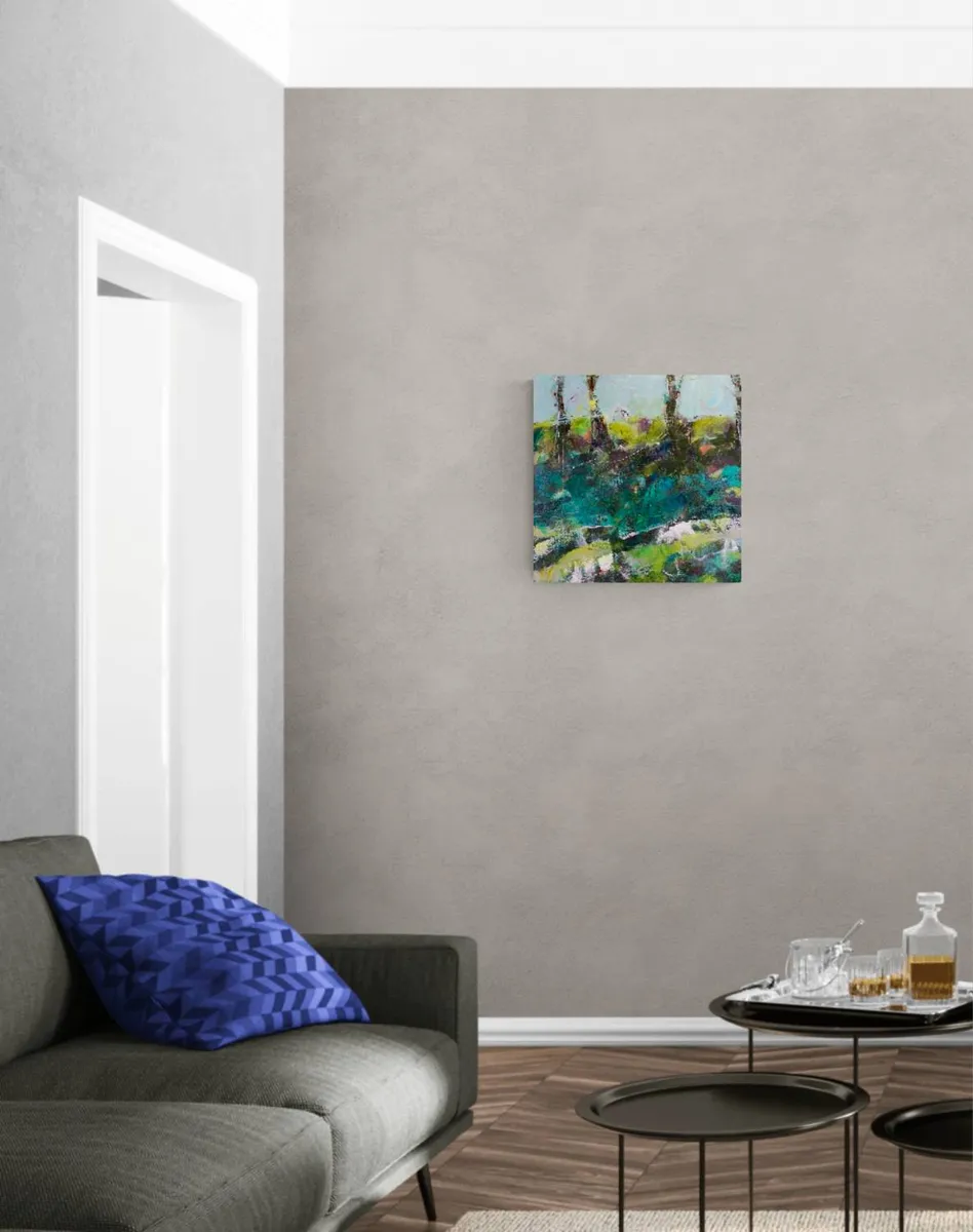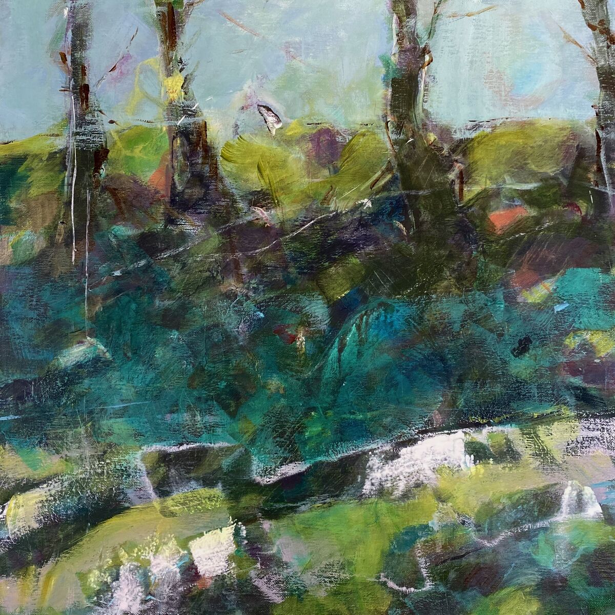 This acrylic painting on linen-wrapped canvas reflects the layered terrain of western Pennsylvania, blending abstraction and suggestion to capture the energy of the natural world. Greens and teals dominate the palette, evoking the dense forest, while earthy tones and fragmented white forms hint at sunlight and the fleeting presence of a dog within the landscape. Loose, sweeping brushstrokes contrast with refined, layered applications, creating depth and movement that mirrors the light and shadow of the woods. The piece invites viewers to experience the mood and rhythm of the forest—alive, textured, and constantly shifting—while rooted in a deep sense of place. White Dog Green Woods was named as a Finalist in the Tervarna Nature 2024 International Juried Competition.