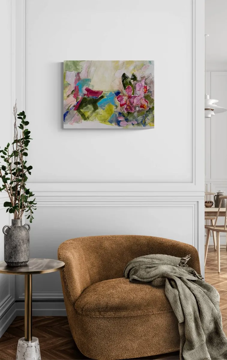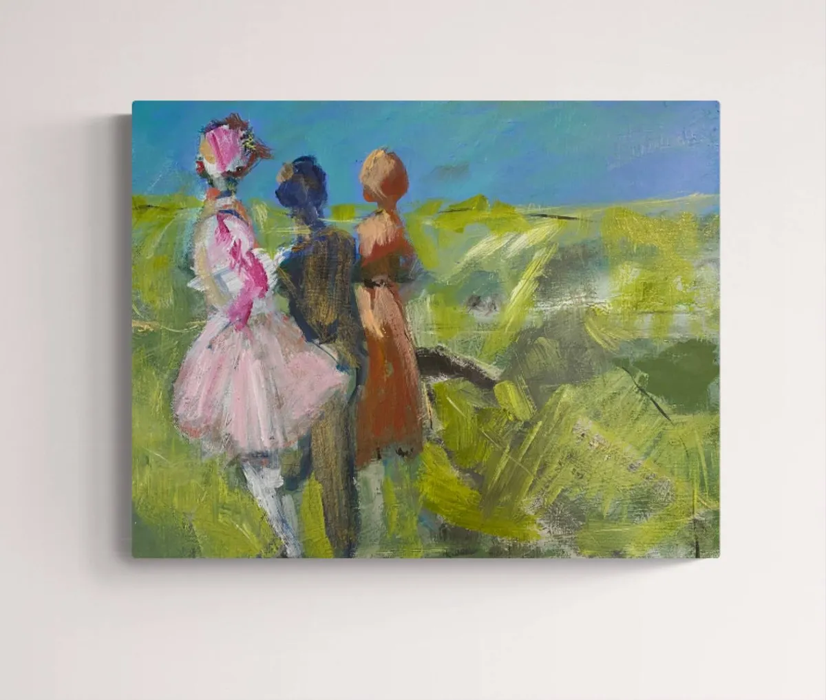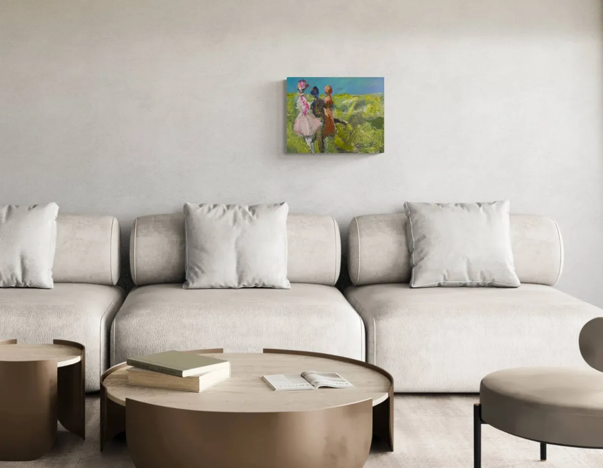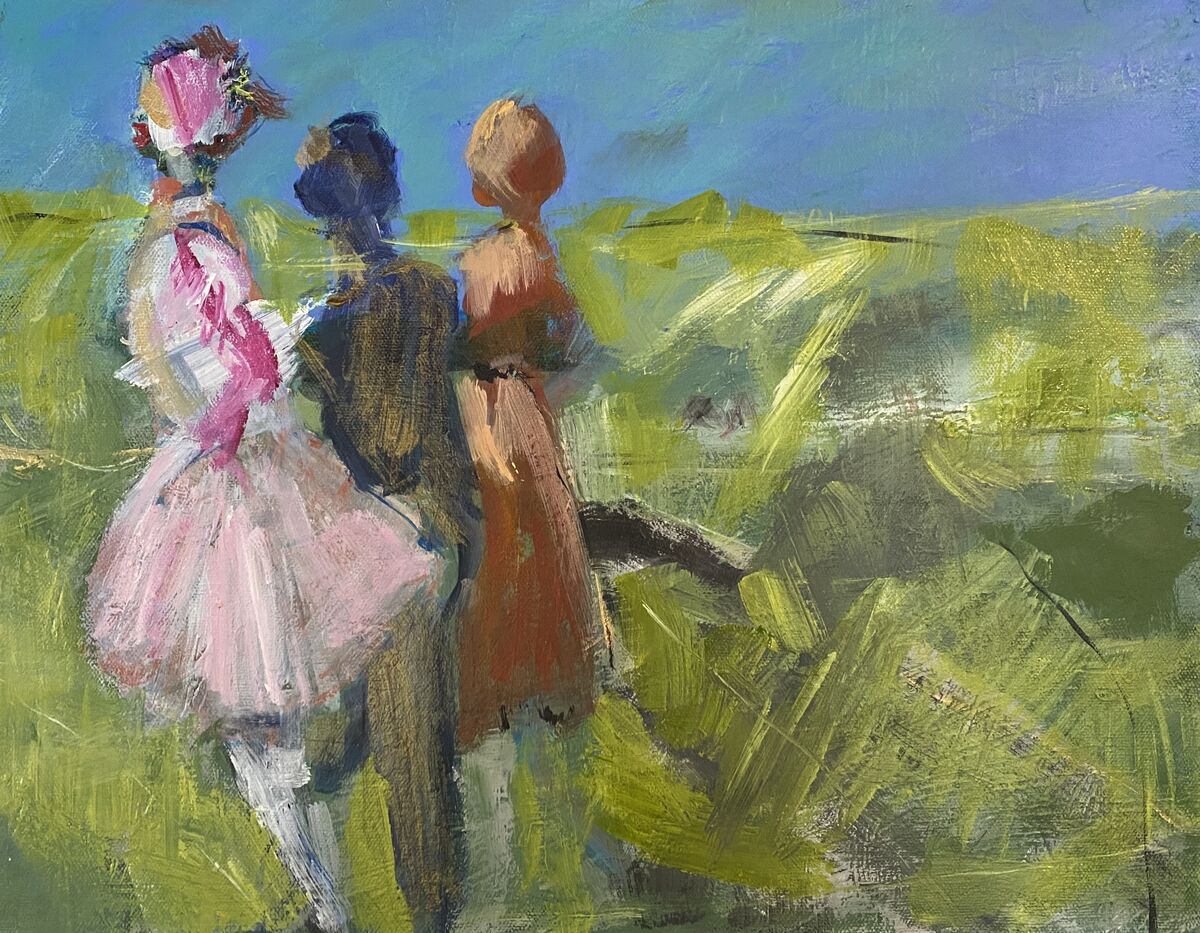 This painting on wrapped gallery canvas explores the idea of time and connection. The three figures, set in a vibrant, open landscape, evoke the interplay between the past, present, and future. Their forms blend with the surrounding environment, reflecting how time and experience are deeply intertwined. The piece features bold, expressive brushstrokes and layered textures that give it depth and movement. The inspiration for this piece is captured in Albert Einstein’s quote: “The distinction between the past, present, and future is only a stubbornly persistent illusion.”