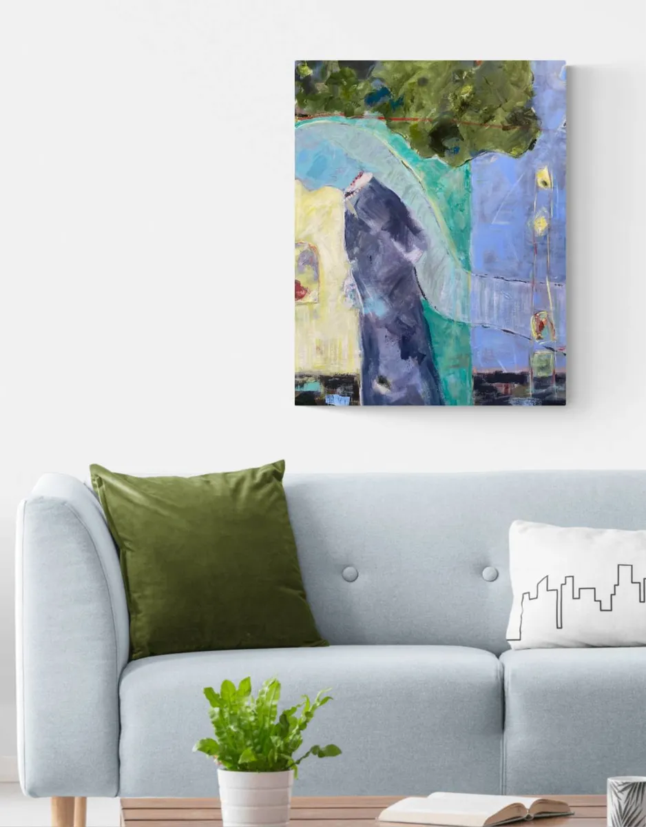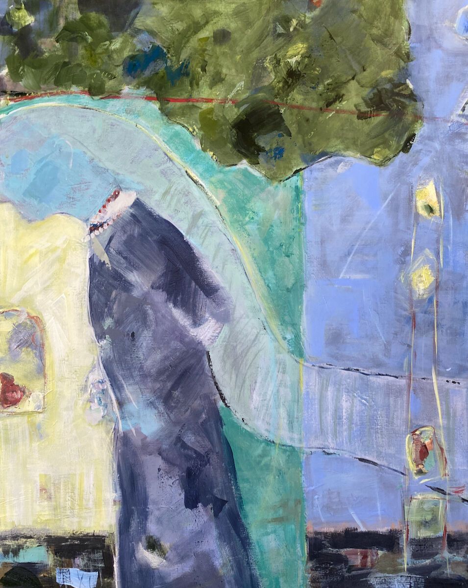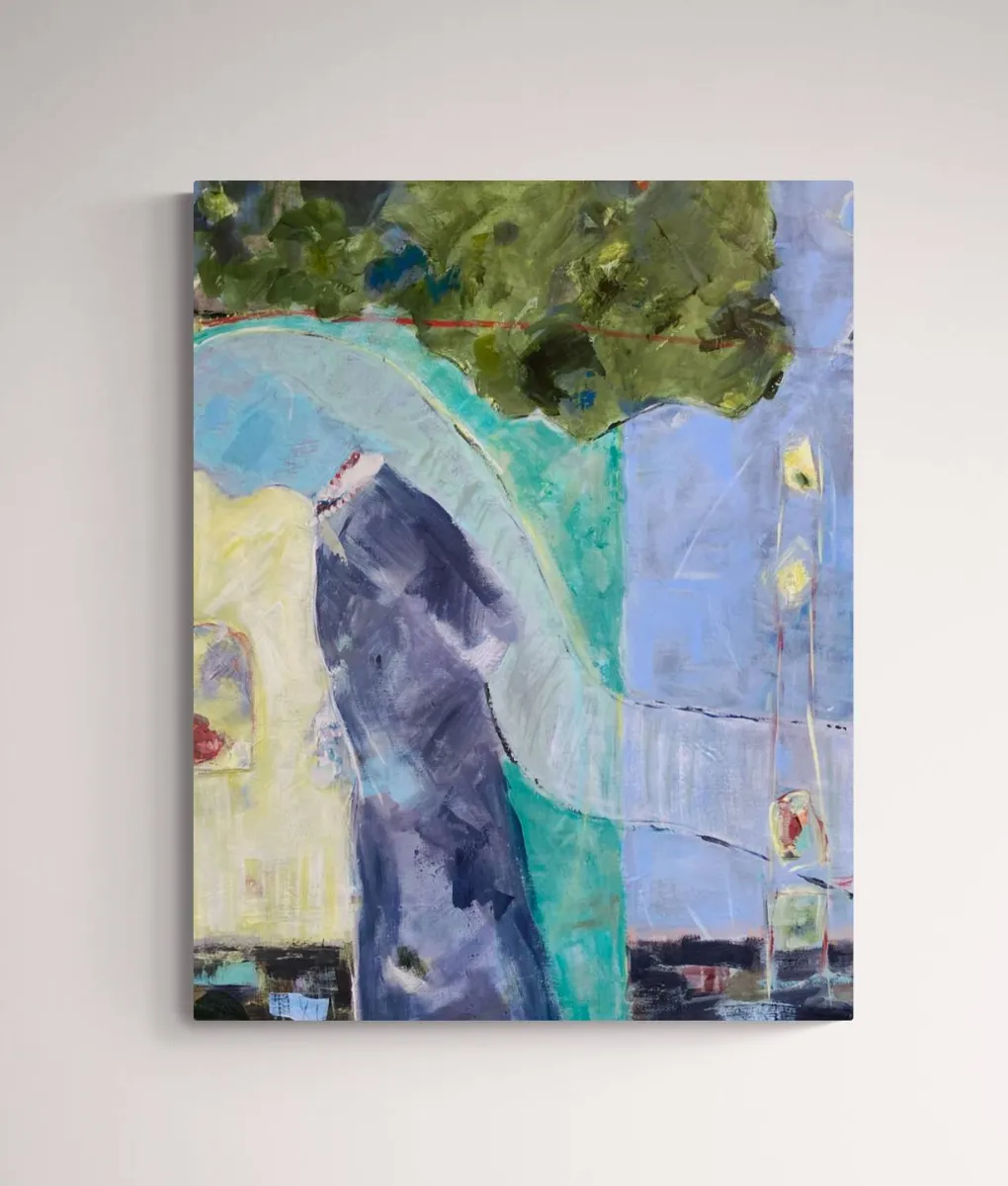 This abstract acrylic painting on linen wrapped canvas captures an imagined moment in Venzone, Italy. A woman walks deliberately past an open arched door at daybreak. Part of a diptych with 3PM, the two works reveal a circular connection between two times of day, exploring the quiet beauty and rhythm of daily life. Layered brushstrokes, a muted palette of blues, greens, and yellows, and the fluid, abstracted figure create a sense of structure and transience. The figure blends into her surroundings, reflecting the way we move through spaces, leaving subtle imprints. This piece combines abstraction with a touch of narrative, celebrating the patterns and poetry found in life’s simple, familiar moments.