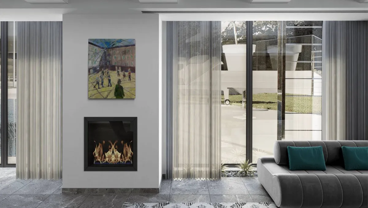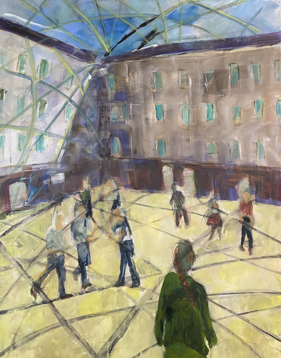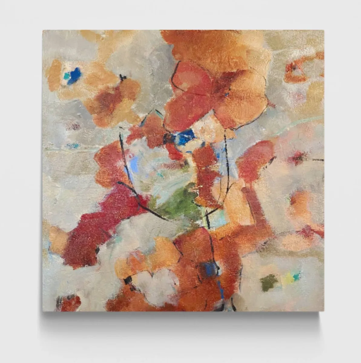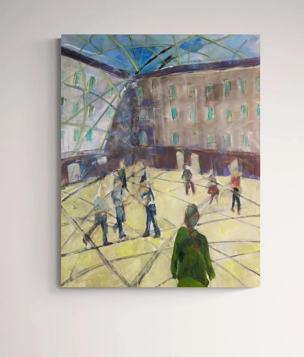 This abstract acrylic painting on linen wrapped canvas captures an imagined moment in Venzone, Italy. A woman walks deliberately past an open arched door at daybreak. Part of a diptych with 3PM, the two works reveal a circular connection between two times of day, exploring the quiet beauty and rhythm of daily life. Layered brushstrokes, a muted palette of blues, greens, and yellows, and the fluid, abstracted figure create a sense of structure and transience. The figure blends into her surroundings, reflecting the way we move through spaces, leaving subtle imprints. This piece combines abstraction with a touch of narrative, celebrating the patterns and poetry found in life’s simple, familiar moments.